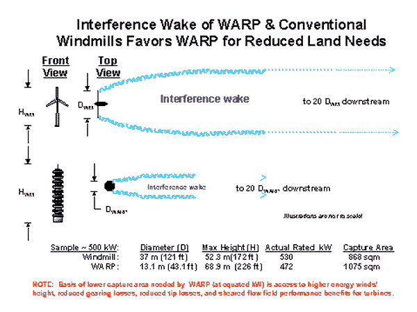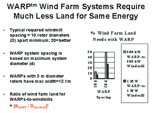 Clearly, taller and more powerful WARP units can be used relative to conventional large diameter windmills (which have size and height limits of about 100 meters) so area use would drop even further for a WARP wind farm, or, conversely, energy capture would increase substantially for a WARP wind farm.